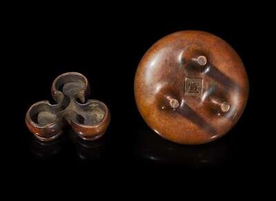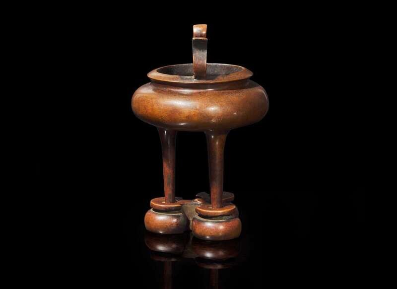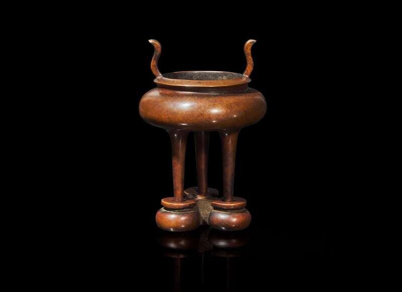 The compressed globular censer raised on gracefully attenuated tapered legs, a pair of serpentine handles at the lip, underside with raised "Xuan" in a square; all on a conforming lobed base; the dense metal of a reddish tone, the patina of rich chestnut brown and black.