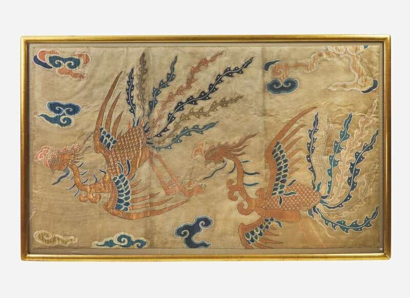 Depicting two soaring phoenix amidst scrolling clouds; framed and glazed