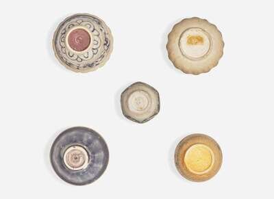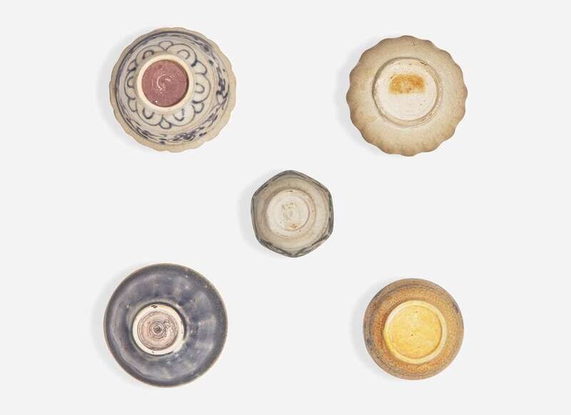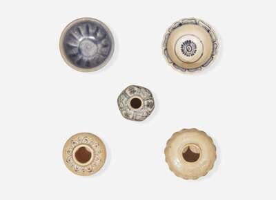 Comprising a blue-glazed ribbed bowl; a blue and white bowl with petal-rim; a blue and white jarlet; a lobed pale-glazed jarlet; a blue and white jarlet decorated with sparrows H: 1 1/2 in (largest)