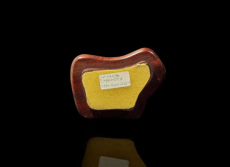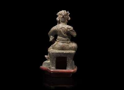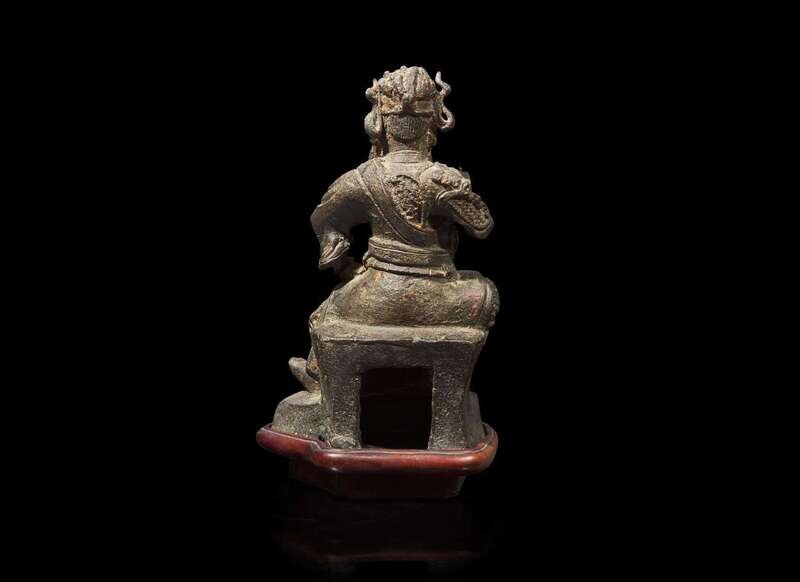The martial guardian energetically modelled, seated holding his handsome beard in hand, his armor decorated with refined patterns, with later wood stand