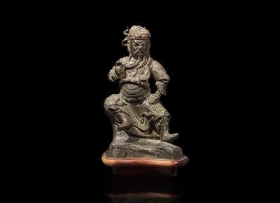 A small Chinese patinated bronze model of Guandi, Ming dynasty 關帝銅像 明