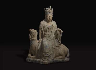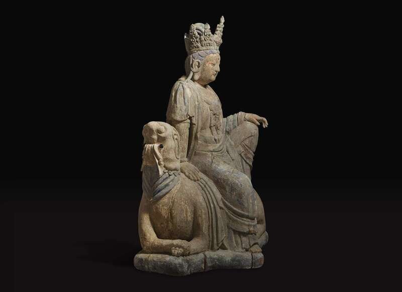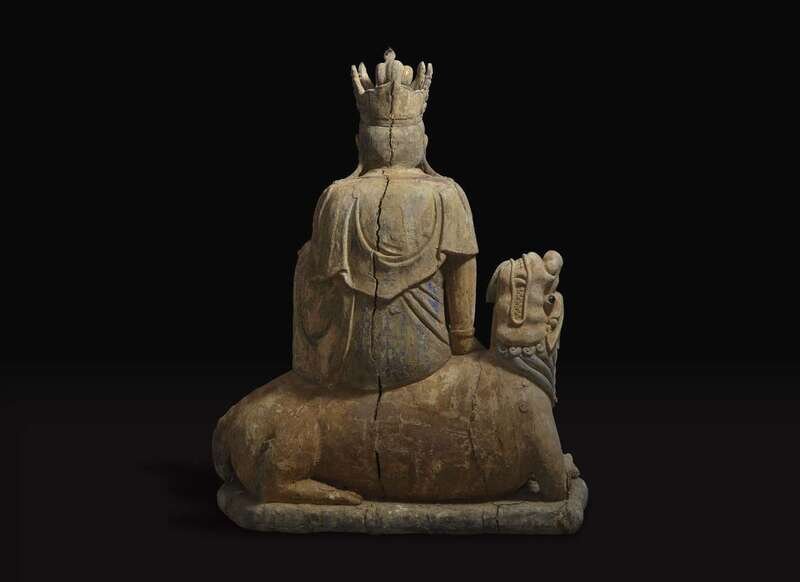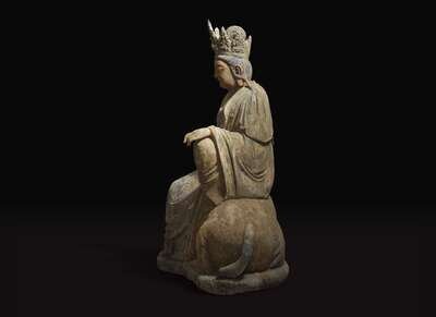 In Ming dynasty style, the graceful crowned deity in elegant robes, seated on a recumbent lion, traces of polychromy to the surface.