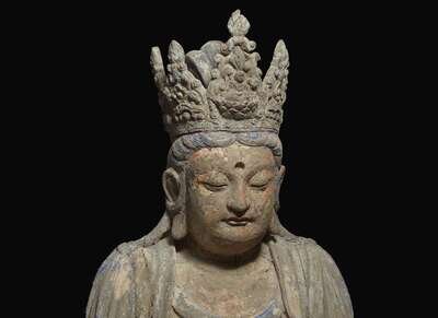 A very large Chinese carved and polychromed wood figure of "Shi Hou Guanyin" 大型獅吼觀音雕塑