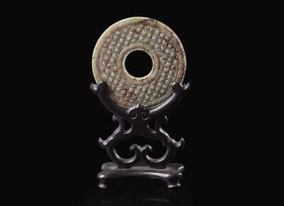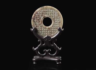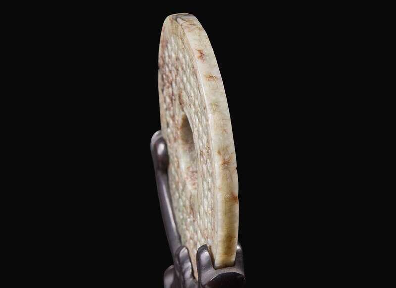 A Chinese archaistic carved mottled grey and russet jade bi disc 玉璧一件