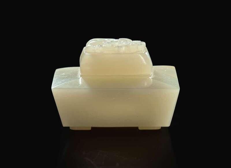 Carved with a high relief qilong holding a lingzhi on the cover, cloud scroll border to side of the tapered rectangular body, all above four low bracket feet.
