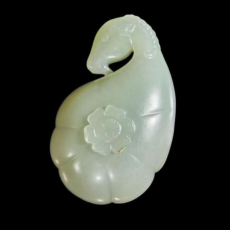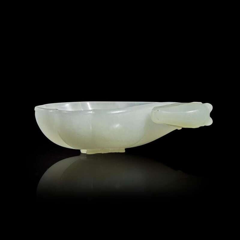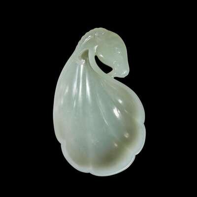 A small Chinese carved pale celadon jade Mughal-style coupe 痕都斯坦風格羊首小杯
