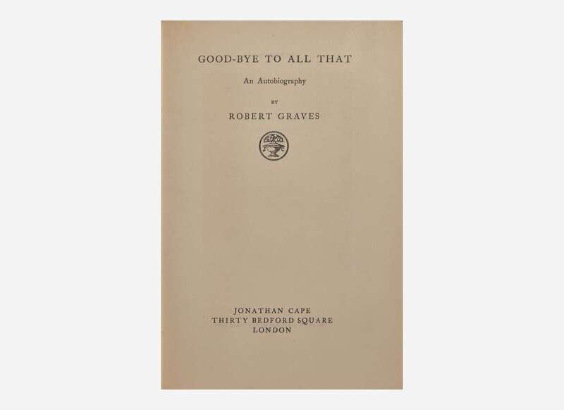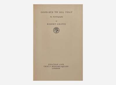 A scarce near-fine and unexpurgated first edition of Robert Graves's classic memoir of the First World War, containing the two passages that were later removed at the furious insistence of Graves's one-time friend and fellow poet, Siegfried Sassoon. Sassoon was critical of several aspects of Graves's autobiography, including what he saw as Graves’s inaccurate depiction of his and other soldiers' wartime service. He took particular offense at Graves's description, on p. 290, of Sassoon's grieving mother's attempts to communicate with the spirit of his dead younger brother Hano, as well as Grave's unauthorized inclusion of Sassoon's poem, on pp. 341-343. Soon after the book's publication, Sassoon arranged with publisher Jonathan Cape to have these passages removed in all the remaining unissued copies.