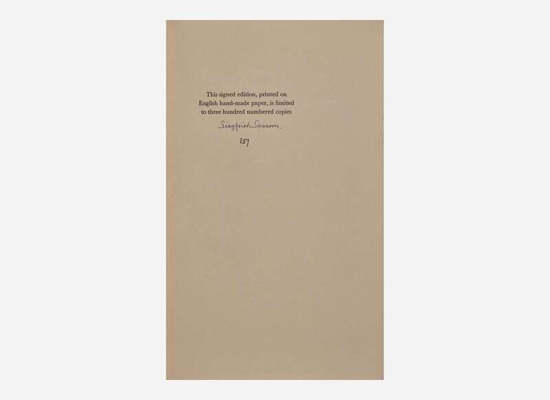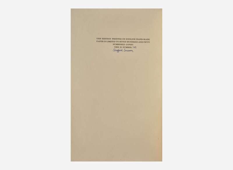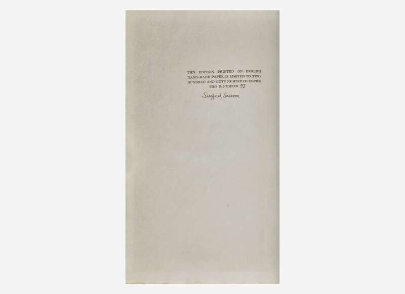 London: Faber & Gwyer Limited, 1928. Second and limited edition, #93/260 copies, signed and numbered by Sassoon. 8vo. 395, (1) pp. Publisher's blue buckram, stamped in gilt, spine darkened; top edge gilt, other edges untrimmed; small book-plate on front paste-down; offsetting to endpapers; text partially unopened; transparent tissue dust-jacket wanting. Keynes A30b