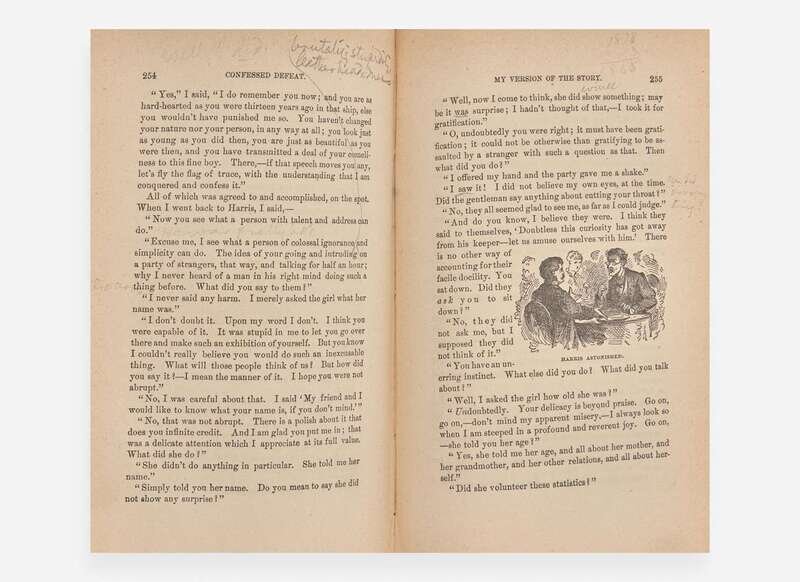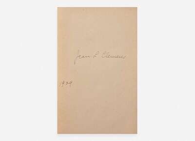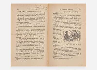 Mark Twain's personal copy of his satiric and entertaining memoir of his travels through Europe, marked throughout with his often humorous autograph annotations, comments, and revisions. The annotations by Twain appear on over 50 pages, and are almost certainly stage directions made by him in preparation for public readings of stories from the book. On the front free endpaper Twain has listed 16 sections from this volume, including “114-Hunting the sock-20 min,” “247-The pretty girl at Schweitzerhof 30 to 35,” "36 The Blue-jays," “215 The Ant," “440 The Grandson,” etc. Further annotations in the text notate pauses, intervals of time, with some markings seeming to emphasize passages and others partially or completely crossing out portions of text.