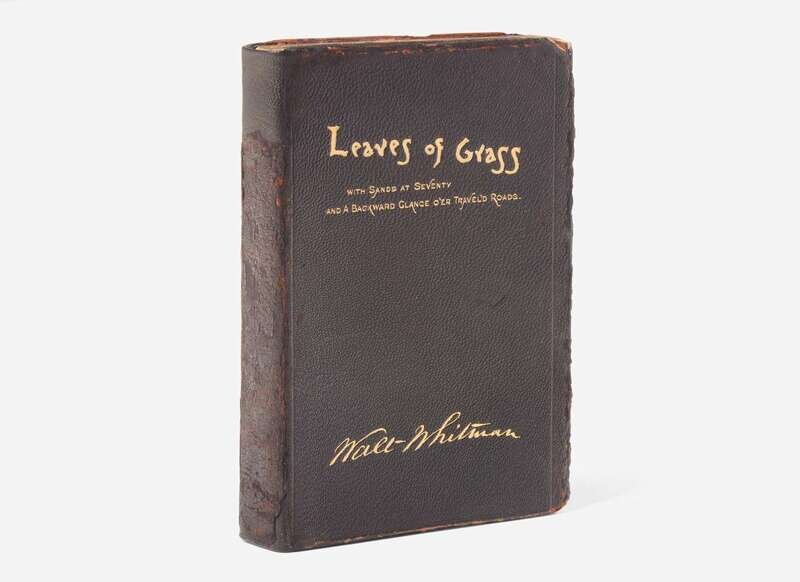 A scarce copy of Walt Whitman's 70th birthday edition of Leaves of Grass, one of only 300 copies published. "To-day, finishing my 70th year, the fancy comes for celebrating it by a special, complete, final utterance, in one handy volume, of L. of G., with their Annex, and Backward Glance--and for stamping and sprinkling all with portraits and facial photos, such as they actually were, taken from life, different stages. Doubtless, anyhow, the volume is more A PERSON than a book. And for testimony to all, (and good measure,) I here with pen and ink append my name: Walt Whitman".