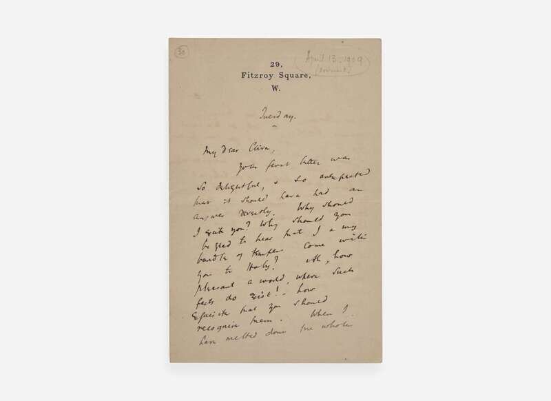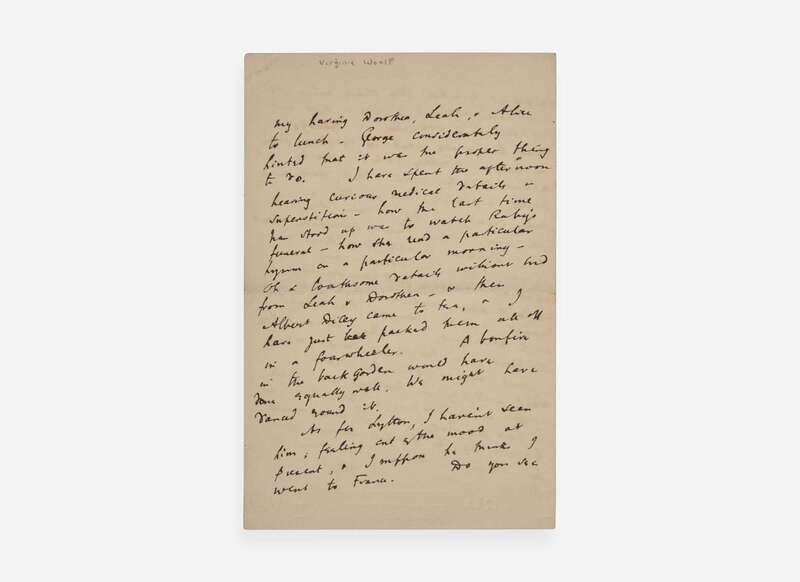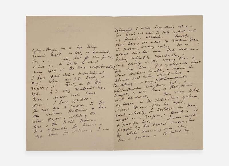 (London, April 13, 1909). Comprising two sheets; one sheet folded to make four pages, and one single sheet, 6 x 4 in. (152 x 102 mm). Lengthy five-page autograph letter, on 29, Fitzroy Square, W. stationery, from Virginia Woolf to her brother-in-law Clive Bell, recounting her "sepulchral day" including the funeral and will of her aunt Caroline Emilia Stephens, Woolf's obituary for her, as well as mentioning her sister Vanessa Bell and Lytton Strachey. Creasing from contemporary folds. Printed in The Letters of Virginia Woolf, Volume I: 1888-1912 (481, pp. 391-391).