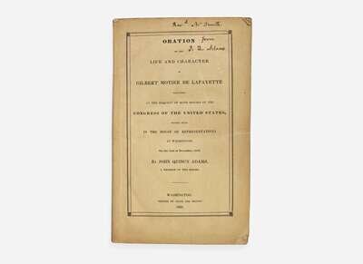 First edition in rare original wrappers of John Quincy Adams's speech commemorating the life and character of Revolutionary War hero Marquis de Lafayette. Lafayette died on May 20, 1834, and this speech was read by Adams before both houses of Congress and a packed crowd of spectators, on December 31. Rev. Edward Dunlap Smith (1807-83) served as pastor of the Second Presbyterian Church in Washington, D.C.--where Adams often attended his sermons--and on December 1, 1834 was appointed chaplain of the U.S. House of Representatives. He served until 1835, before moving to New York City where he preached at Old Chelsea Presbyterian Church for 30 years.