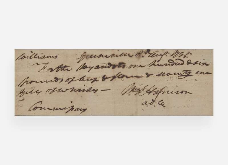 A scarce document signed by future president William Henry Harrison five days after the signing of the Treaty of Greenville, requisitioning food and goods for the Wyandot people. Signed on August 3, the Treaty of Greenville temporarily ended hostilities in the Northwest between the United States and a coalition of Native American tribes, consisting of the Wyandot, Shawnee, Delaware, Ottawa, Chippewa, Miami, Pottawatomi, and others. The Treaty redefined the boundary line between Native America and the United States, with the tribes ceding most of modern-day Ohio and parts of Indiana, Illinois, and Michigan. In addition, the tribes received $20,000 dollars worth of goods, including a $9,500 annuity divided among each of the twelve tribes, and made up the things such as domestic animals, instruments for husbandry, etc. Here Harrison, then serving as an aide-de-camp to Major General Anthony Wayne, requisitions supplies like beef, flour, and whiskey. This receipt is presumably made out for Isaac Williams, Jr., a Wyandot trader from Sandusky and a liaison with the American Army who had signed the Treaty of Greenville on behalf of the Wyandot. Williams, Jr., (1765-1857), was born to a white man, and Wyandot women; his brother, Abraham, was a witness and interpreter at the signing of the Treaty of Greenville.