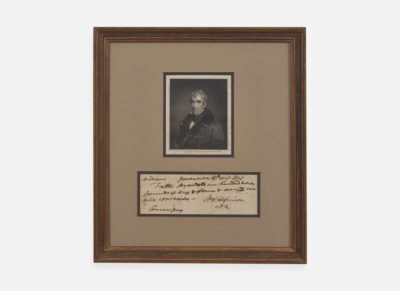Greenville, (Ohio), Aug(ust) 8th, 1795. Single oblong sheet, 2 3/4 x 7 3/4 in. (70 x 197 mm). Autograph document, signed by William Henry Harrison as aide-de-camp at Fort Greenville, likely for Isaac Williams, Jr., liaison and delegate of the Wyandot people, requisitioning supplies for them from the Commissary of Fort Greenville: "Williams…For the Wyandots one hundred & six pounds of beef & flour & seventy one gills of whisky--Wm. H. Harrison a.d.c."; docketed on verso, "No. 158". Creasing from contemporary folds. In mat with engraved portrait of Harrison, and in frame, 14 3/4 x 13 1/4 in. (375 x 336 mm).