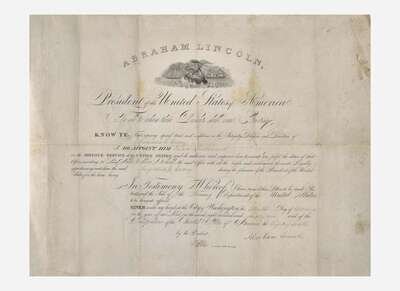 A handsome commission signed by President Abraham Lincoln, appoint Augustus G. Carey a Third Lieutenant in the Revenue Service. Carey served with distinction in the Revenue Cutter Service during the Civil War, bearing witness to the famous clash of the Monitor and Merrimac at the Battle of Hampton Roads on March 8, 1862. He was an officer aboard the great steamship Great Eastern before his retirement in 1874.