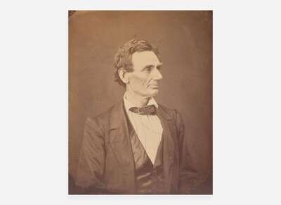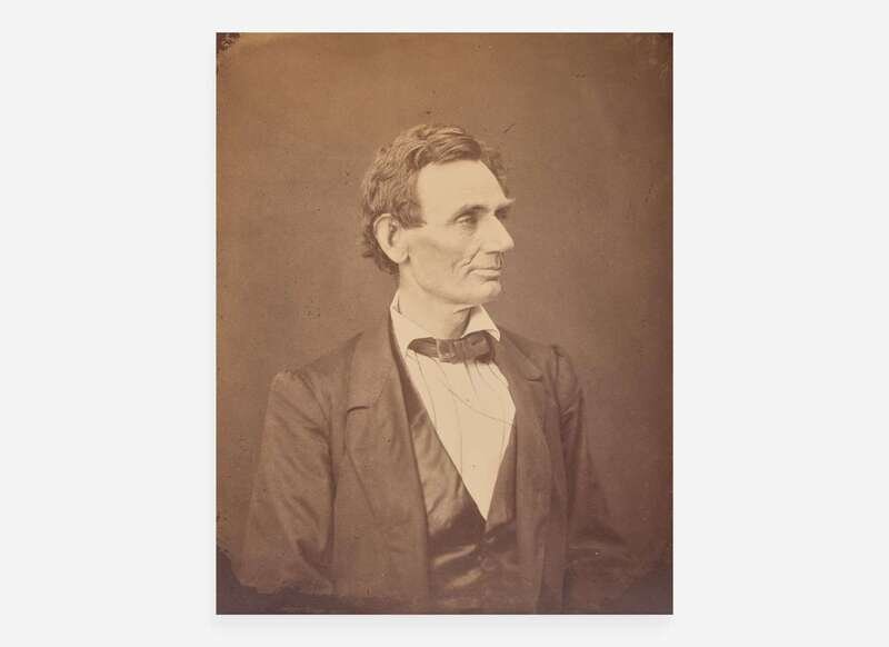 A handsome example of Chicago photographer Alexander Hesler's iconic photograph of Abraham Lincoln. Originally taken on June 3, 1860, this image was one of four photographs Hesler took that day of the future president, in Springfield, Illinois. Only two weeks before this sitting, on May 18, Lincoln was nominated as the Republican Party presidential candidate at the Republican National Convention, held in Chicago, and in five-months time he would be elected to the presidency. In 1867, Hesler sold some of his original glass negatives to Philadelphia photographer George B. Ayres--saving the images for posterity, as Hesler's studio was destroyed during the Great Chicago Fire of 1871. Ayres began selling his own copies from the original plates in the 1880s, while also producing his own duplicate glass negatives. These glass plates were then irreparably damaged in 1933 while being shipped to Washington, D.C.