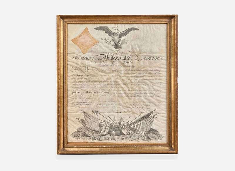 Washington, (D.C.), December 26, 1814. Single vellum sheet, 17 5/16 x 14 7/8 in. (440 x 378 mm). Partially-printed military commission, executed in a secretarial hand and signed by James Madison as President of the United States, appointing William Linnard "Quarter Master General with the brevet rank of Colonel"; counter-signed by James Monroe as Vice-President; paper seal at top. Creasing from contemporary folds; Monroe's signature somewhat faded; Madison's signature sometime traced over; scattered light spotting.