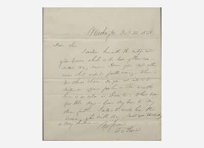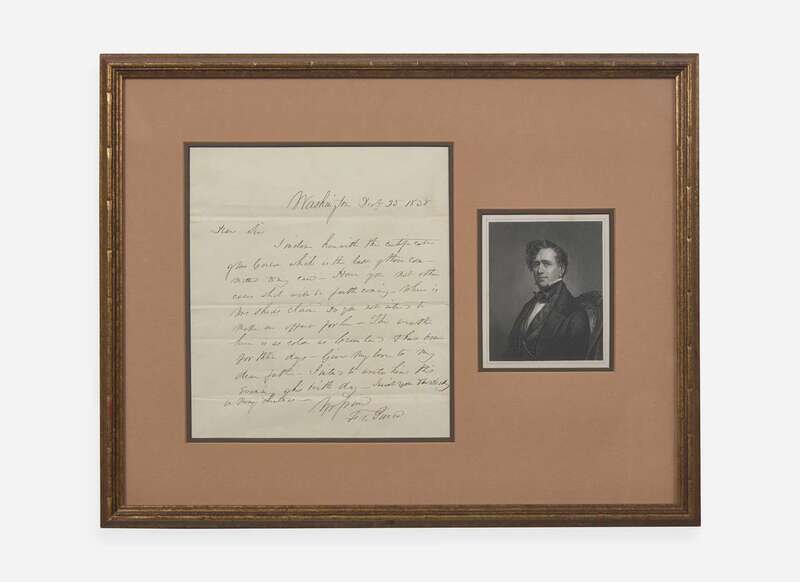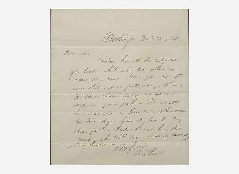 Washington, Dec(ember), 25, 1838. One sheet folded to make four pages, 10 x 8 in. (254 x 203 mm). One-page autograph letter, signed by future 14th president of the United States, Franklin Pierce, as a United States Senator from New Hampshire, to a Mr. Dickey: "Dear Sir, I inclose herewith the certificate of Mrs. Gould which is the last of them committed to my case--Have you not other cases which will be forth coming--Where is Mrs Sheds claim? Do you not intend to make an offer for her--The weather here is as cold as Greenland & has been for these days--Give my love to my dear father--I intend to write him this Evening of his birth day--I wish you & Mrs Dickey a merry Christmas--Yr friend Fr. Pierce" Creasing from contemporary folds; docketed on verso "F. Pierce". Im mat with an engraved portrait of Pierce, and in frame, 14 1/2 x 18 1/4 in. (368 x 463 mm).