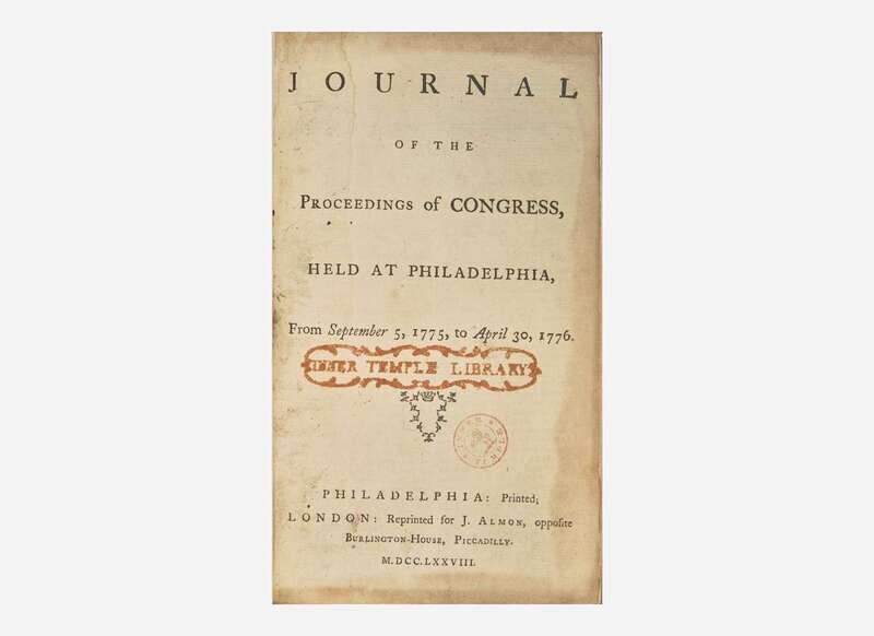 Collection of London printings of the early proceedings of the Continental Congress. The first two works in the first volume cover the entirety of the First Continental Congress, from its first session beginning on September 5, 1774, and include the Declaration of Rights, the Continental Association, addresses to the people of Great Britain and to the inhabitants of the colonies, the Petition to the King, etc. The third text records the transactions of the Second Continental Congress, from its first session on May 5, 1775, through to August 1, and includes the "Declaration of the Causes and Necessity for Taking up Arms", the rules and regulations of the Continental Army, the appointment of George Washington as Commander-in-Chief, the Olive Branch Petition, etc. The second volume is the first English edition of the journals of the Second Continental Congress, covering their proceedings from September, 1775, to April, 1776.