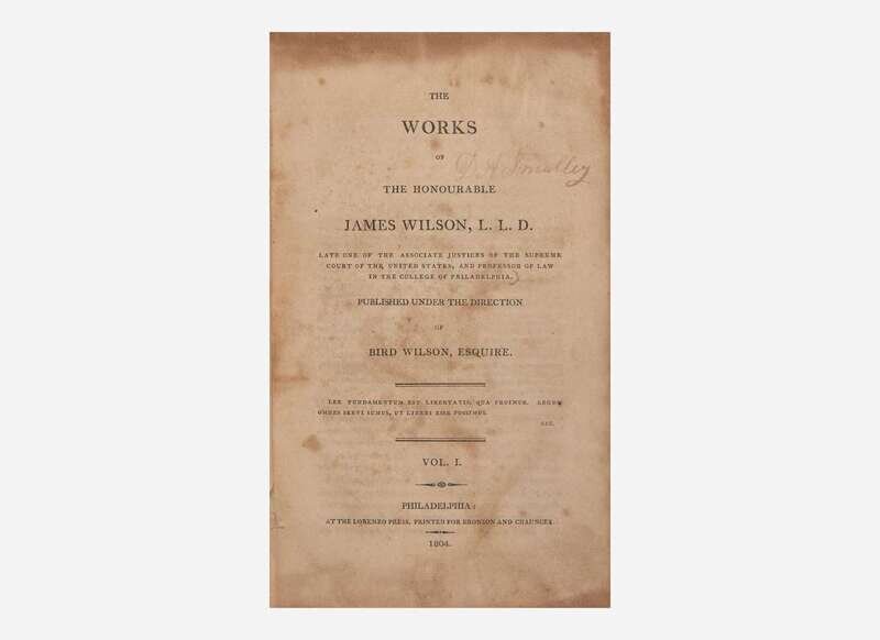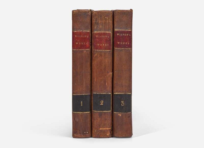 Scarce set of Founding Father James Wilson's lectures on law, compiled and edited by his son, Bird Wilson. One of only six signers of both the Declaration of Independence and the Constitution, Wilson was one of early America's most prominent legal theorists. One of the most influential members of the Constitutional Convention of 1787, as a delegate from Pennsylvania his ideas served as the basis for the presidency, the formation of the electoral college system, and the negotiation of several compromises regarding slavery. In 1789, he was appointed one of the first four Supreme Court Justices, during which he also lectured on law at the College of Philadelphia. The current set is made up of these lectures, which Wilson intended to publish as a treatise on American Law, but was left unfinished upon his death from malaria, in 1798.