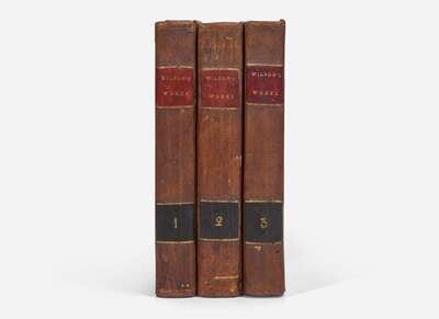 Philadelphia: At the Lorenzo Press, Printed for Bronson and Chauncey, 1804. In three volumes. First edition. 8vo. xvi, 467; vi, 497; iv, 439, (1) pp. Edited by Bird Wilson. Illustrated with an engraved frontispiece portrait of Wilson in first volume. 19th-century full tan calf, red and black morocco spine labels, stamped in blind and in gilt, boards variously soiled and dampstained; all edges trimmed; ownership signature, dated 1856, on front paste-down of each volume; foxing and dampstaining to frontispiece; foxing and offsetting to title-pages; light foxing and offsetting to text throughout set; scattered light dampstaining in top corner of most leaves in second volume; wear and toning along edges of pp. (67)-70 in third volume. From the library of United States District Judge David Allen Smalley (1809-77) and with his name blindstamped on front board of each volume, and with his signature on title-page of each volume. Sabin 104632; Shaw and Shoemaker 7780