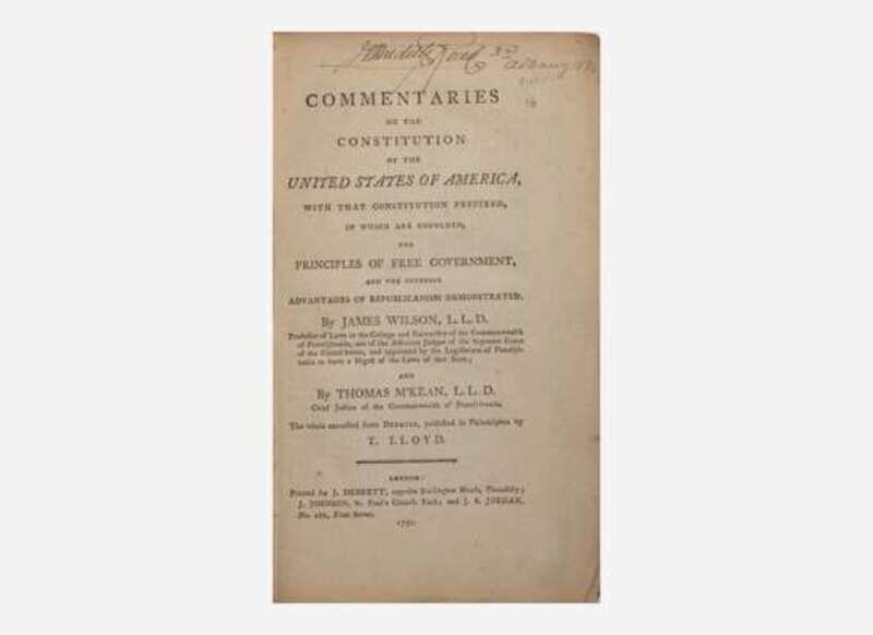 Rare first English edition of James Wilson and Thomas McKean's speeches in favor of the Federal Constitution, given during the contentious Pennsylvania ratification debates of 1787. These speeches were recorded by reporter Thomas Lloyd and were first published privately in Philadelphia in 1788 under the title The Debates of the Convention of the State of Pennsylvania. This English edition is considered by Sabin and Ford to be a reissue, using the remainder of those 1788 sheets, but with the inclusion of a new title-page and pp. 20-23, that were printed in England.