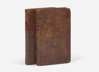 Philadelphia: Printed by Jones, Hoff & Derrick, and Jacob Johnson & Co., 1793-94. In two volumes. First edition. 12mo. xii, 226; (xii), 216 pp. Contemporary American binding by J. Stitt, Rochester of full tree calf, red morocco spine labels, stamped in gilt; all edges trimmed; and with his binder’s ticket on front paste-down of each volume; top portion of front paste-down in each volume excised; contemporary ownership signature on title-page of each volume and in pencil on final page of each; scattered soiling and spotting to text. Sabin 85589; Evans 26179 and 27716