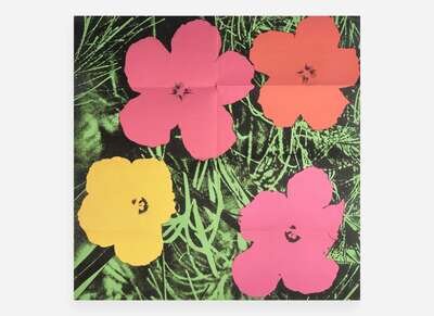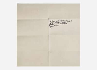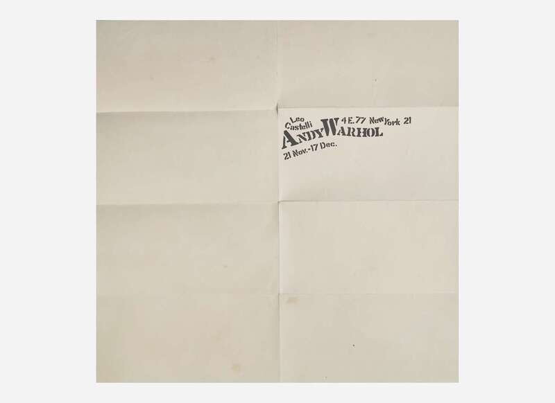 A mailer invitation printed for Andy Warhol’s inaugural exhibition at the Leo Castelli Gallery in New York, held from November 21-December 17, 1964. The show consisted solely of Warhol's Flower paintings, one of which was featured on this printed invitation. The works were based on a series of images that accompanied an article about photographic color processing in the June 1964 issue of Modern Photography. The original image was taken by the magazine’s executive editor, Patricia Caulfield, and was reproduced numerous times in the article to illustrate the effect of different exposure times and filter settings. Caulfield later threatened to sue Warhol over the unauthorized use of her work, and she was offered two sets of Flowers portfolios as payment for the use of her work, but declined the offer in lieu of a cash settlement. The Flowers sold well, both at the time of the exhibition and as part of Castelli’s inventory during 1965.
