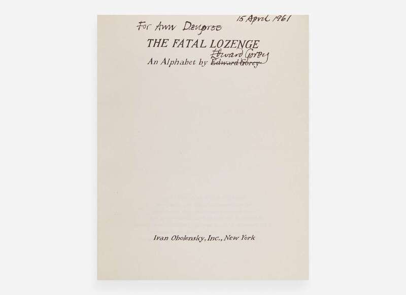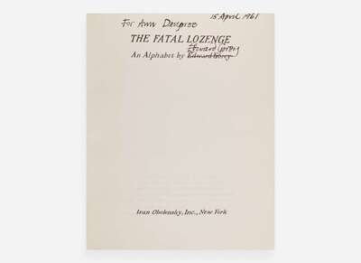 New York: Ivan Obolensky, Inc., (1960). First edition. 16mo. Unpaginated. Inscribed, signed, and dated by Gorey on title-page. Stiff illustrated wrappers, spine and joints rubbed. Toledano A6a