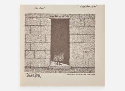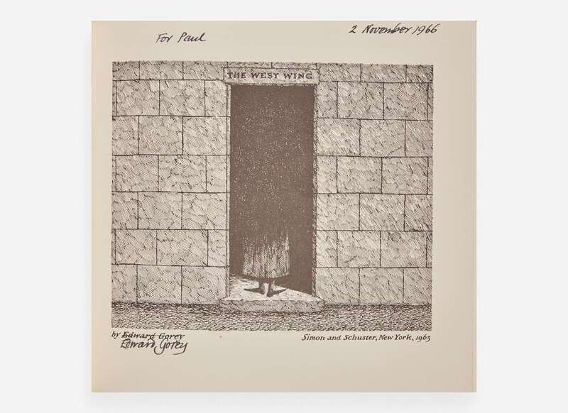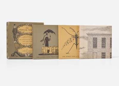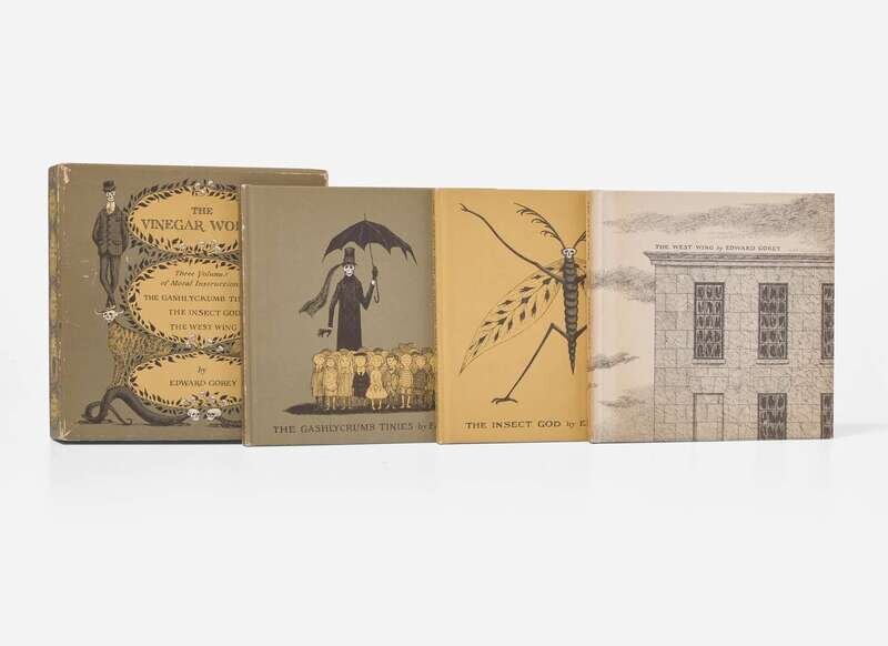 New York: Simon and Schuster, 1963. In three volumes. First edition. Oblong 16mo. Each inscribed by Gorey on title-page: “For Paul 2 November 1966.” Titles include: The Gashlycrumb Tinies, The Insect God, and The West Wing. Green, yellow, and white illustrated paper-covered boards, respectively; spines very lightly worn; boards of The West Wing unevenly toned; publisher's illustrated paper-covered slipcase, lightly worn. Toledano A13