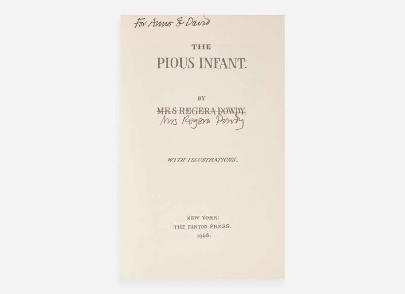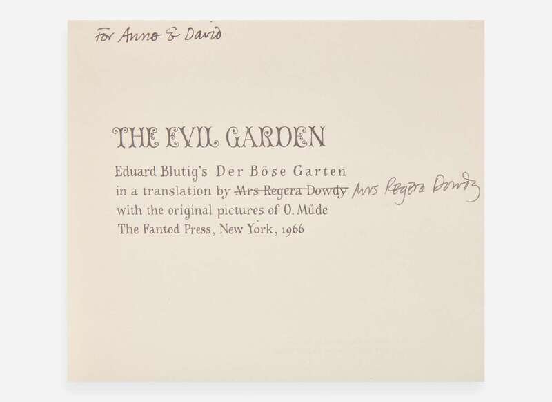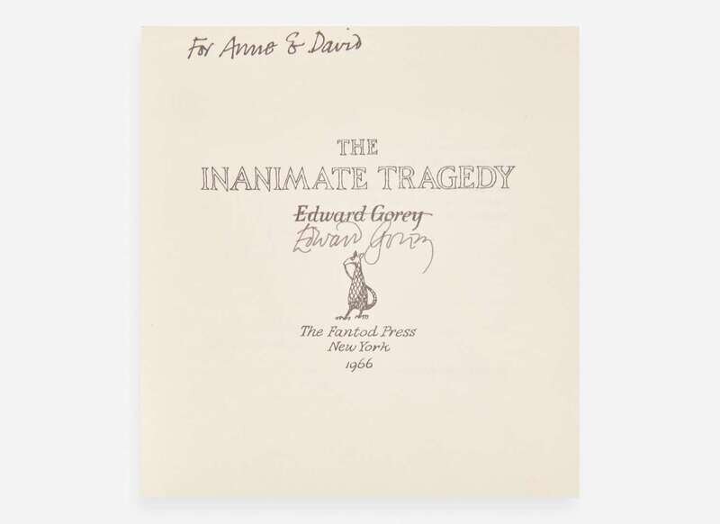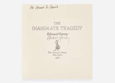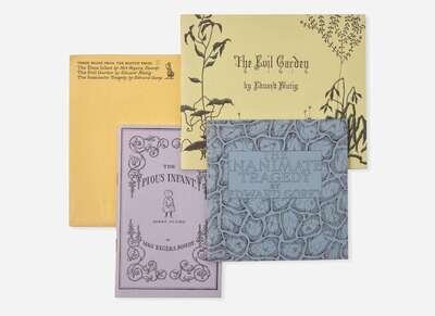 New York: The Fantod Press, 1966. In three volumes. First and limited edition, one of 500 sets in publisher's illustrated yellow envelope. Sizes vary. Unpaginated. Each inscribed and signed “For Anne & David” by Gorey on title-pages, twice using his pseudonym “Mrs Regera Dowdy.” Titles include: The Pious Infant, The Evil Garden, and The Inanimate Tragedy. Stiff illustrated purple, light green, and blue wrappers respectively. Toledano A24