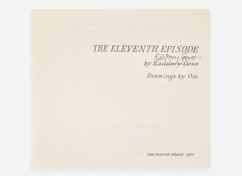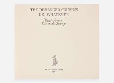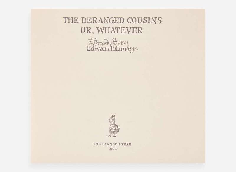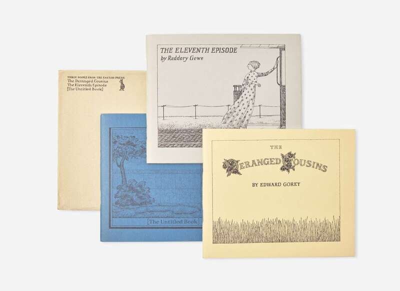 No place, The Fantod Press, (1971). In three volumes. First trade edition, one 500 sets in publisher's illustrated tan envelope. Oblong 24mo. Unpaginated. Each signed on title-page by Gorey, including: The Deranged Cousins, The Eleventh Episode, and [The Untitled Book]. Stiff illustrated yellow, gray, and blue wrappers respectively. Toledano A42b