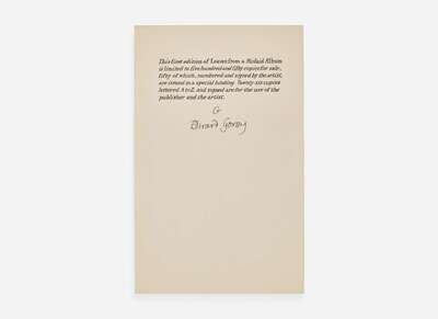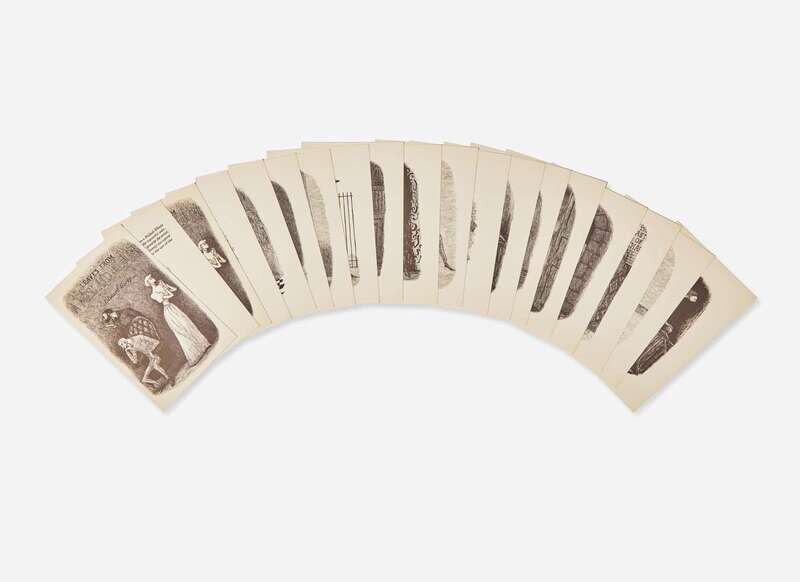 (New York: Gotham Book Mart & Gallery, Inc., 1972). First and limited edition, letter G of 26 lettered sets, (from a total edition of 576) signed by Gorey. Comprising 18 illustrated cards, loose as issued, each 7 x 4 1/2 in. (178 x 114 mm). Publisher's marbled paper-covered portfolio, with illustrated cover and spine label; black cloth ties; split in front joint, but sound. Toledano A46a