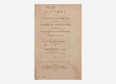 First edition of Mercy Otis Warren's groundbreaking history of the American Revolution, considered the "first important historical work by an American woman." (Howes) One of the first and most comprehensive histories of the Revolution and one of the first non-fiction works by a woman published in America. History was released when Otis was 77, and was the culmination of her long 30-plus year pioneering career publishing poetry, plays, and political pamphlets, often in the service of the patriot cause. The work traces the Revolution from its beginnings with the Stamp Act through to the years after the war's end, and is noted for its "expert knowledge...of public affairs and for its lively and penetrating commentary upon the leading figures of the day." (DAB)