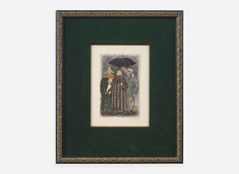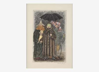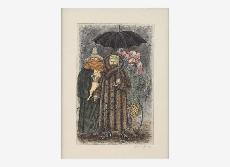 Circa 1976. Pen and ink with watercolor on wove paper, signed by Gorey in pencil below image. 5 1/2 x 3 1/2 in. (140 x 89 mm) illustration on 7 3/4 x 7 3/8 in. (197 x 187 mm) sheet. In mat and in frame, 13 1/4 x 11 in. (336 x 279 mm).