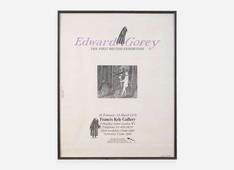 London, 1979. Printed poster for a British exhibition of Gorey's work at the Francis Kyle Gallery from February 20-March 23, 1979. Signed by Gorey bottom right. 15 1/2 x 19 3/4 in. (397 x 501 mm). In frame, 20 1/2 x 16 1/2 (520 x 419 mm). Toledano p. 159