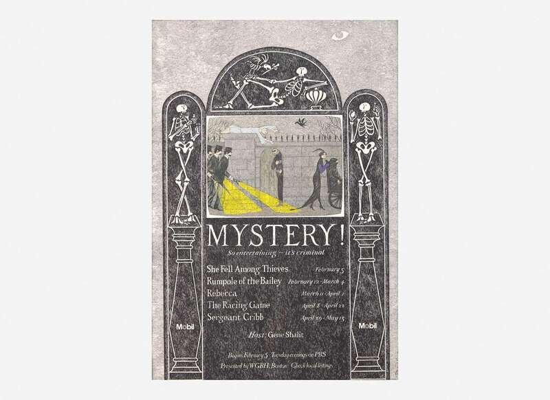 No place, ca. 1980s. Printed color poster advertising the PBS television series, Mystery! 22 1/2 x 15 1/2 in. (sight) (557 x 393 mm). Signed by Gorey bottom right. In frame, 23 1/4 x 16 1/4 in. (590 x 412 mm). Toledano p. 159