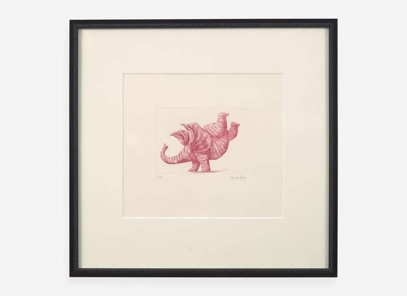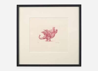 No place, no date. Limited edition print of a pink elephant, #85/95, signed by Gorey. 9 x 10 in. (sight) (229 x 254 mm). In frame, 16 1/4 x 16 13/16 in. (425 x 431 mm). Toledano p. 162
