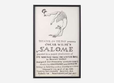 No place, ca. 1995. Limited edition poster for a production of Oscar Wilde's Salome, #6/50 numbered copies, signed by Gorey bottom right. 16 x 10 1/2 in. (sight) (406 x 266 mm). The play was performed multiple days at the Theater on the Bay (Bourne, Massachusetts) in February of 1995, and was “preceded by a puppet production of Six Who Pass While the Lentils Boil…designed and directed by" Gorey. In frame, 17 x 11 in. (432 x 279 mm). Toledano p. 159