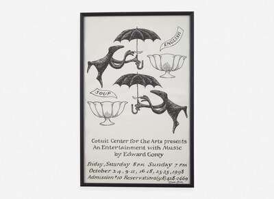 No place, ca. 1998. Printed illustrated poster for “An Entertainment with Music by Edward Gorey” held at the Cotuit Center for the Arts, on Cape Cod in Massachusetts. Signed by Gorey bottom right. 16 1/2 x 10 1/2 in. (419 x 266 mm). In frame, 17 1/4 x 9 1/2 (438 x 241 mm). Toledano p. 159