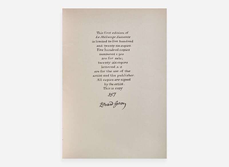 (New York: Gotham Book Mart, 1981). First and limited edition, #357/500 numbered copies (from a total edition of 526), signed by Gorey. 16mo. Unpaginated. Stiff illustrated grey wrappers, a few small stains on the front wrapper. Toledano A81b