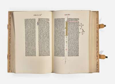 A finely bound facsimile edition of the Gutenberg Bible, the first book printed in the West. This is the first Gutenberg facsimile ever printed in the United States, and only the second facsimile printed in the world. This reproduction derives from the 1913 Insel Verlag facsimile edition, which derives from the copies at Berlin and Fulda, widely regarded as the most beautiful of the 47 copies extant.
