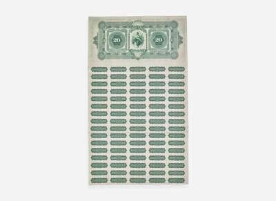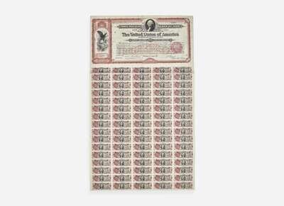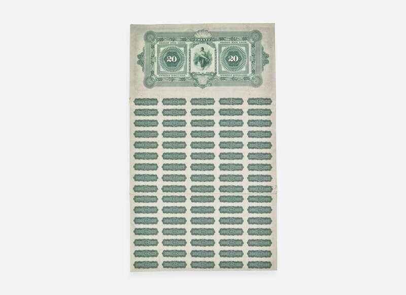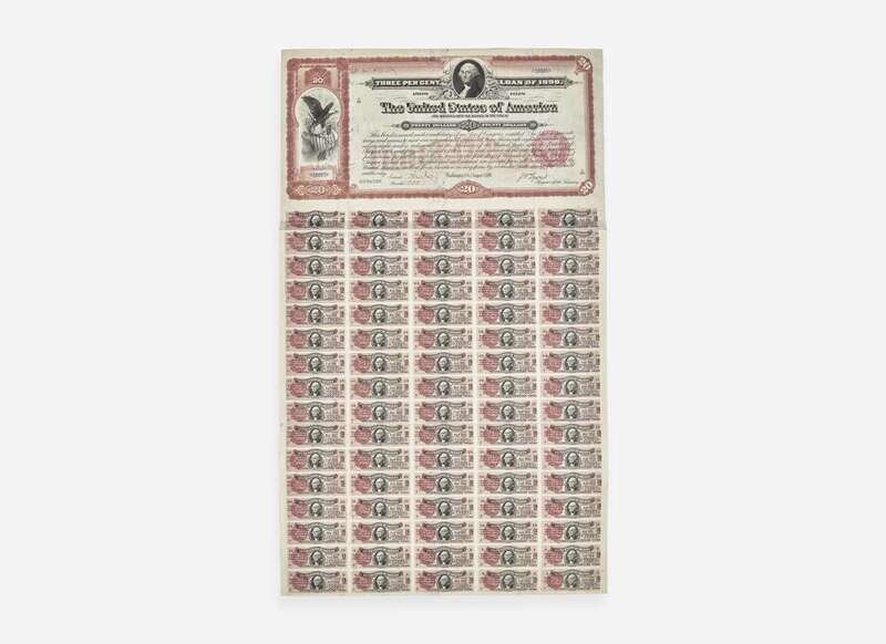 A rare 1898 $20 bond, issued to help fund the Spanish-American War. The 3 per cent loan of 1908-1918, popularly termed the Spanish American War loan, was issued in June, 1898. Subscriptions were invited for $200,000,000 and in response, 320,226 subscriptions were received, amounting to more than $1,500,000,000, of which $198,792,660 were allotted. This lower denomination bond was an affordable option for the public, and appealed to an individual's patriotism. According to the Joe I. Herbstman Collection of American Finance, there are less than twenty known examples of this denomination.