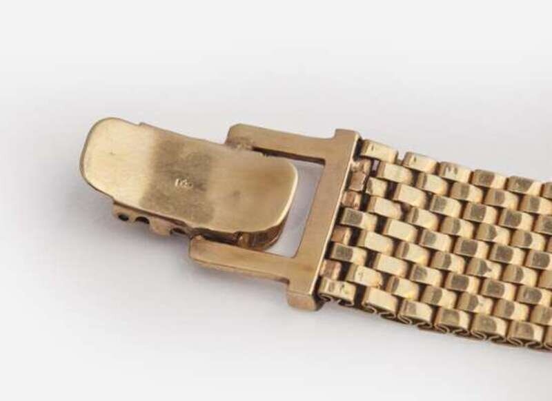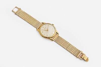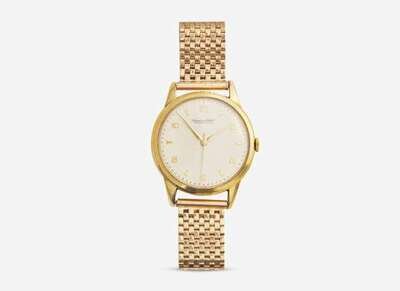 An 18K yellow gold manual wind men's watch by International Watch Company on a 14K yellow gold woven bracelet. The watch features a round white dial with gold Arabic numerals at the 12 o'clock, 2 o'clock, 4 o'clock, 6 o'clock, 8 o'clock, and 10 o'clock hours, gold arrow markers at other hour intervals, and gold dots at minute intervals, with gold arrow hands for hours, minutes, and seconds.