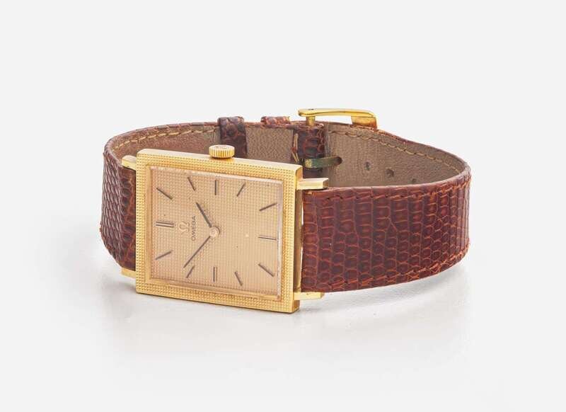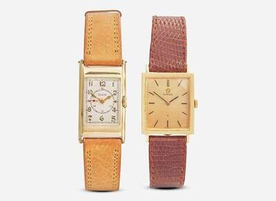 A set of two watches, including a manual wind 18K yellow gold seventeen jewel men's watch by Omega, featuring a rectangular 18K yellow gold textured case, a matching textured yellow gold dial, with black stick markers at hour intervals and black stick hands for hours and minutes. The watch is on a brown leather bracelet with a yellow metal buckle stamped "TIFFANY & Co." The other watch is a 14K yellow gold-filled unisex manual wind Elgin watch, with a rectangular case featuring a white dial with gold Arabic numeral markers at hour intervals, black stick markers at minute intervals, and gold arrow markers for hours, minutes, and seconds. The watch sits on a light brown calf leather bracelet with a yellow metal buckle.