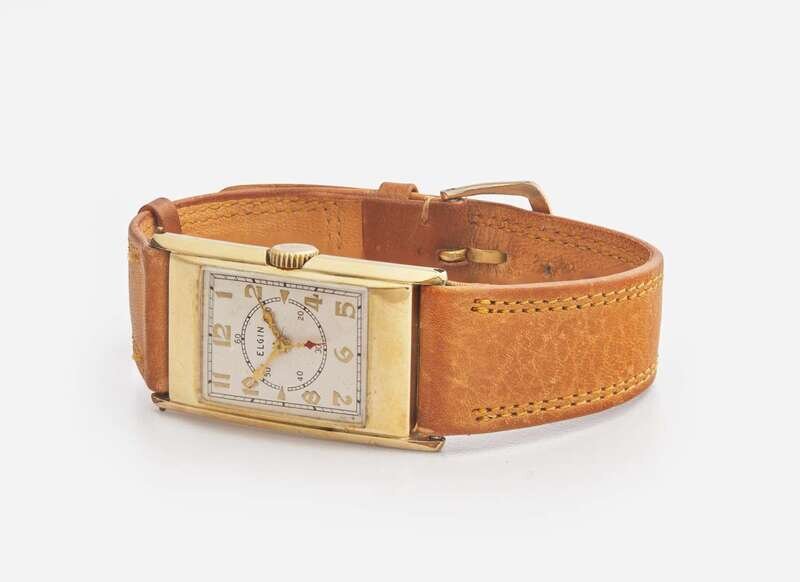 Elgin Condition: Scratches and wear to metal, some scratches to crystal, light discoloration to dial, push/pull crown in working order, some wear and discoloration to leather bracelet particularly around notches, dial reads "ELGIN", case reads "W 14K GOLD FILLED", bracelet reads "11/16 R GENUINCE CALF".
