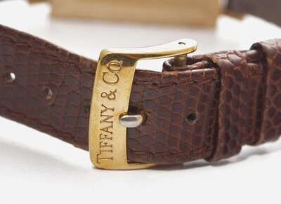 Omega Condition: Light scratches and wear to metal, interior case reads "18K 0.750 OMEGA WATCH Co FAB. SUISSE SWISS MADE 111060" with hallmarks and jeweler's marks, movement reads "22830357 ADJUSTED TWO (2) POSITIONS SEVENTEEN 17 JEWELS OMEGA WATCH CO SWISS 620" with hallmark, dial reads "OMEGA SWISS MADE", buckle stamped "TIFFANY & Co."