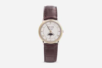 A men's automatic movement Blancpain Villeret Moonphase, featuring a two-tone stainless steel and 18K yellow gold case on a brown Patek Philippe bracelet with a stainless steel Blancpain buckle. The dial is white with applied yellow gold radial Roman numerals, concentric graduation for the date, and apertures for week day, month, and moon phases. The hands are yellow gold feuille, and the dial sits under a scratch-resistant sapphire crystal.
