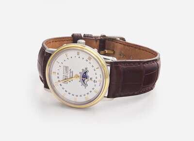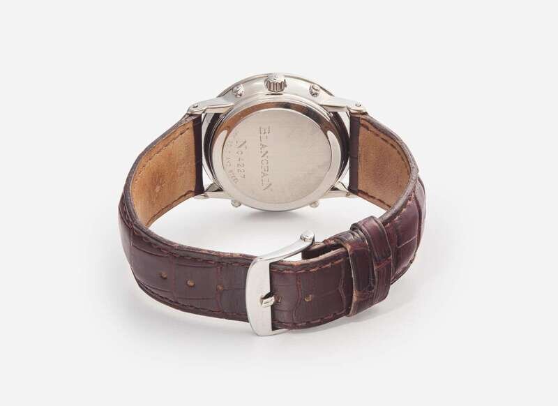 Overall Condition: Will need servicing and repair of the stem and crown, difficulty setting time, discoloration to buckle, minimal scratches to sapphire crystal, wear and cracking to leather bracelet, dial reads "BLANCPAIN automatic IB 1735 SWISS MADE", back of case reads "BLANCPAIN No 4227 18K GOLD AND STEEL", bracelet reads "PATEK PHILIPPE GENEVE", buckle reads "SWISS ACIER INOX BLANCPAIN".