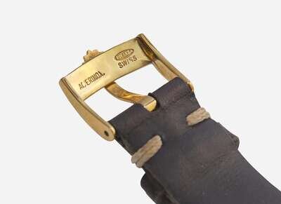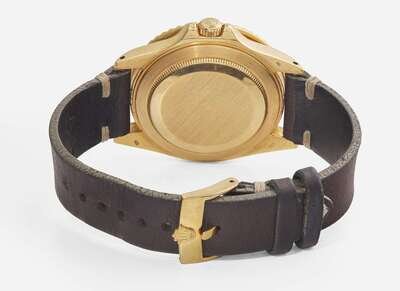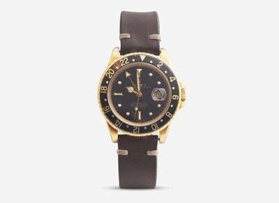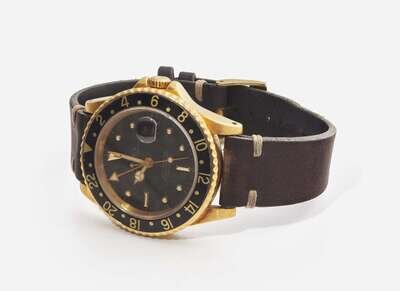Overall Condition: Scratches and wear to metal, watch currently running and keeping time, scratches and light damage to black rotating bezel, some scratches and pits to sapphire crystal particularly around cyclops magnifier, some wear and damage to leather bracelet particularly around notches, the smallest notch appears to have been added later, some discoloration and wear to buckle, dial reads "ROLEX PERPETUAL DATE GMT-MASTER SUPERLATIVE CHRONOMETER OFFICIALLY CERTIFIED SWISS", back of case stamped "18K 750", maker's mark on leather bracelet, buckle stamped "ACIERINOX ROLEKSA SWISS" with Rolex logo.